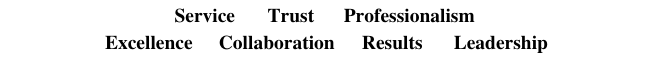 | Service | Trust | Professionalism | Excellence | Collaboration | Results | Leadership |