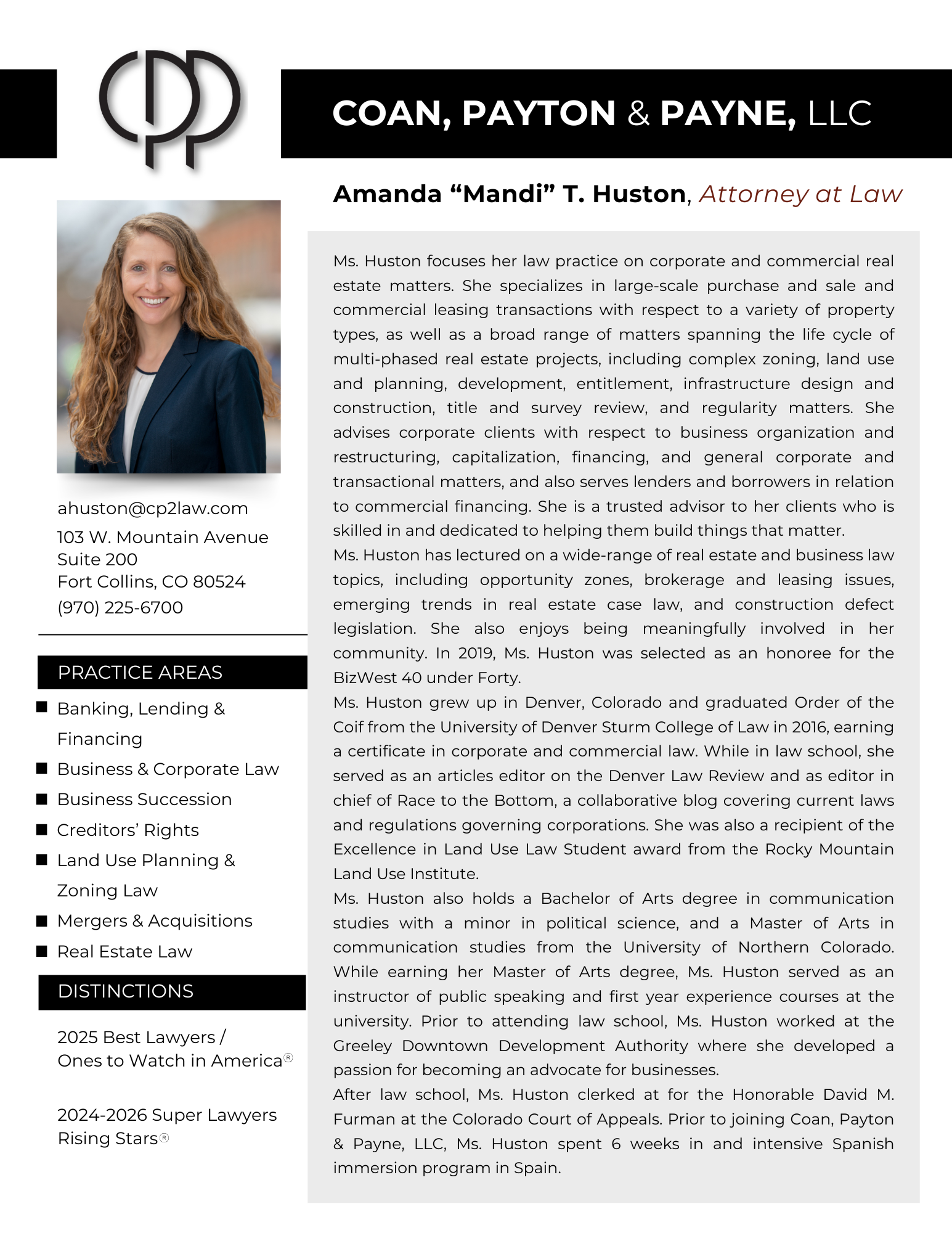 After law school, Ms. Huston clerked at for the Honorable David M. Furman at the Colorado Court of Appeals. Prior to joining Coan, Payton & Payne, LLC, Ms. Huston spent 6 weeks in and intensive Spanish immersion program in Spain.