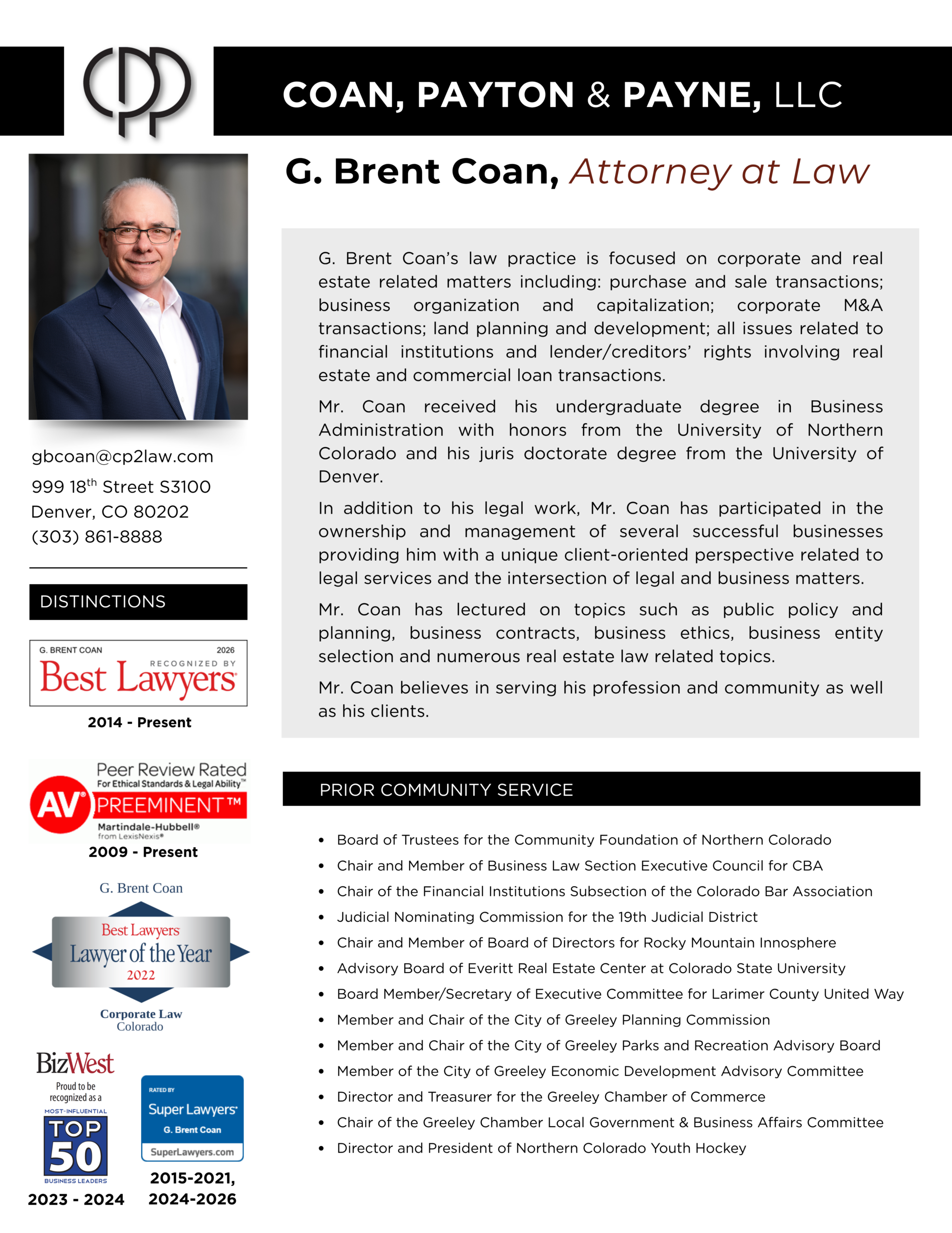Mr. Coan received his undergraduate degree in Business Administration with honors from the University of Northern Colorado and his juris doctorate degree from the University of Denver.